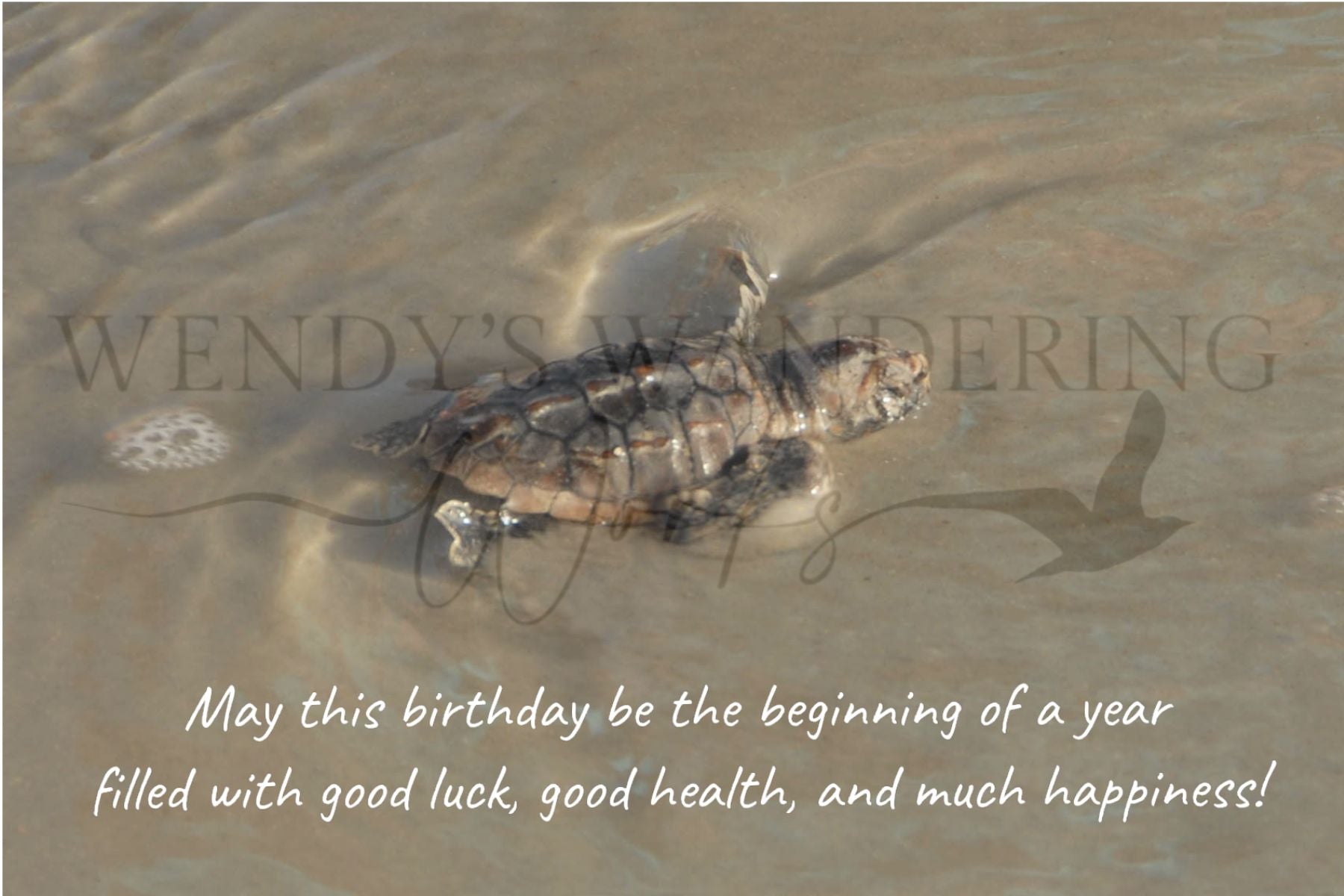 A newly hatched baby loggerhead turtle makes its first journey across the glistening sand toward the vast ocean, full of promise and possibility. The photo captures a tender moment of new life and hopeful beginnings. Along the bottom, the message reads: “May this birthday be the beginning of a year filled with good luck, good health and much happiness.” A beautiful way to celebrate fresh starts and the joy of another year ahead.
