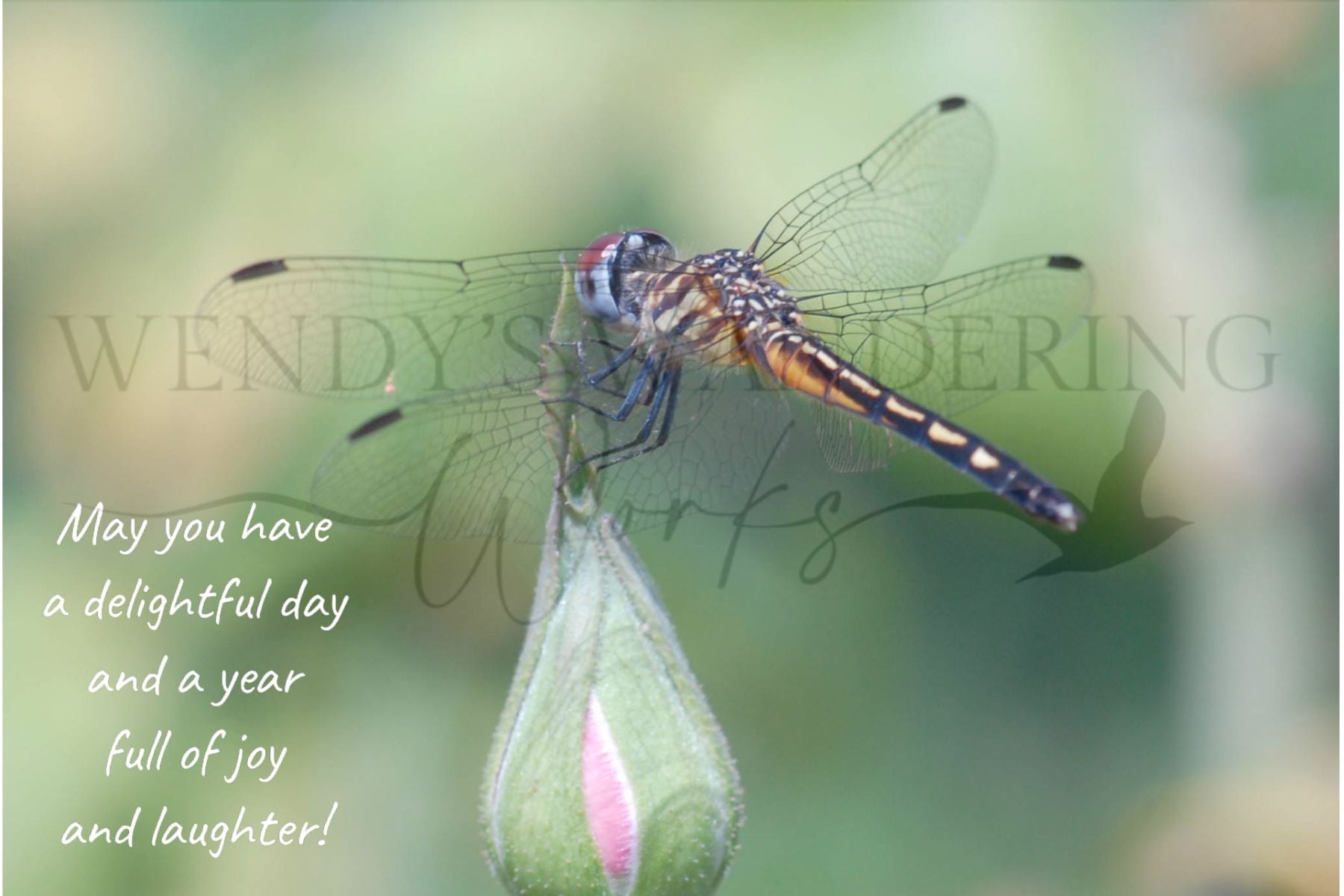 With wings gently outstretched, a Blue Dasher dragonfly perches on a tightly closed pink rosebud, captured from behind as if pausing just for this moment. The scene is quiet, yet full of promise—like the start of a new year. In the bottom corner, a warm birthday wish reads: "May you have a delightful day and a year filled with joy and laughter." A lovely card for someone who brings grace, light, and joy wherever they go.