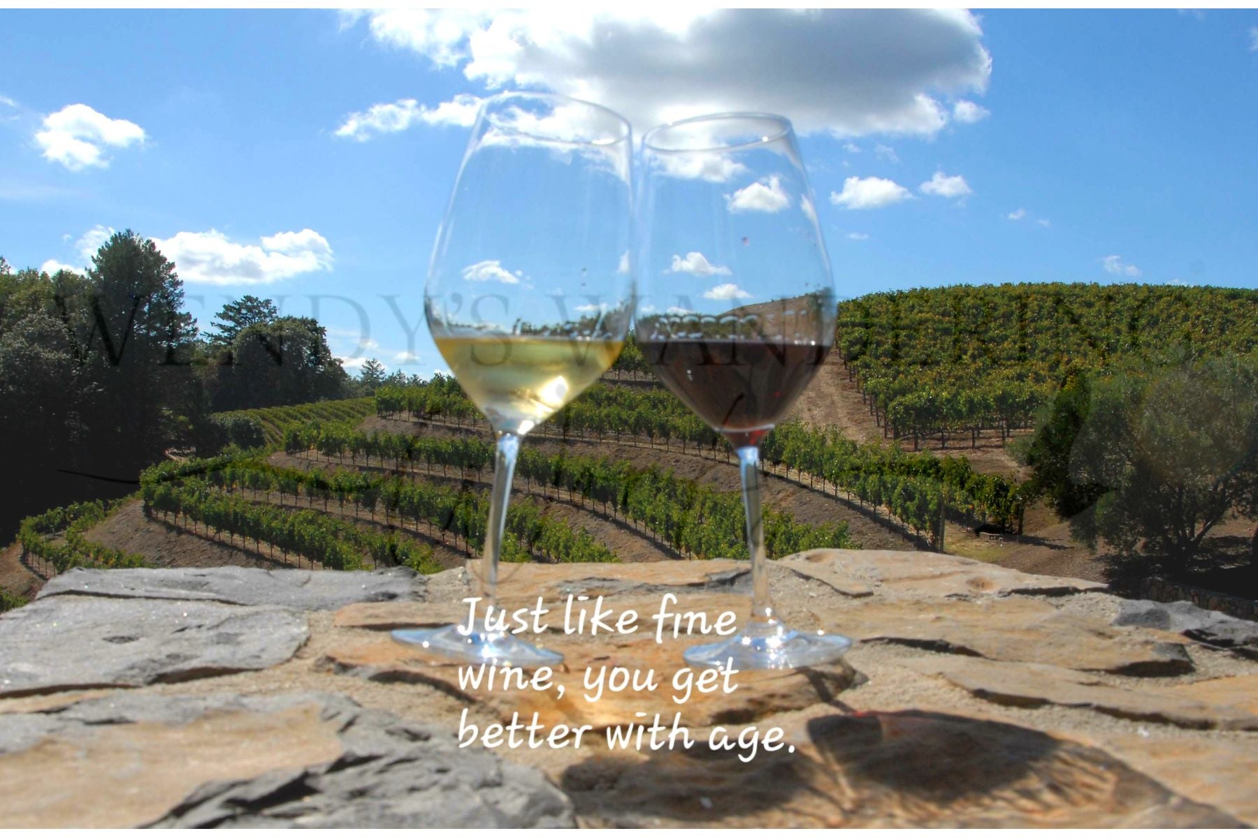 Two wine glasses meet in a joyful clink atop a rustic stone surface, capturing a moment of simple celebration and timeless friendship. Beneath the image, the words read: "Just like fine wine, you get better with age." A classy and heartfelt card perfect for anyone who’s aging with grace—and a great sense of humor.