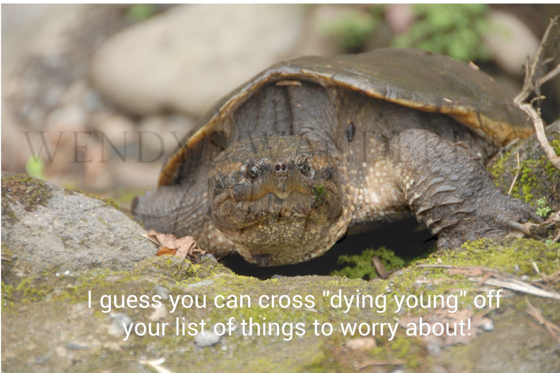 With a weathered shell, mossy perch, and a stare that’s seen it all, this old snapping turtle locks eyes with the camera like he knows the joke already. Across the bottom, the message reads: "I guess you can cross dying young off your list of things to worry about." Perfect for the birthday honoree with a sharp wit and a long memory—just like the turtle
