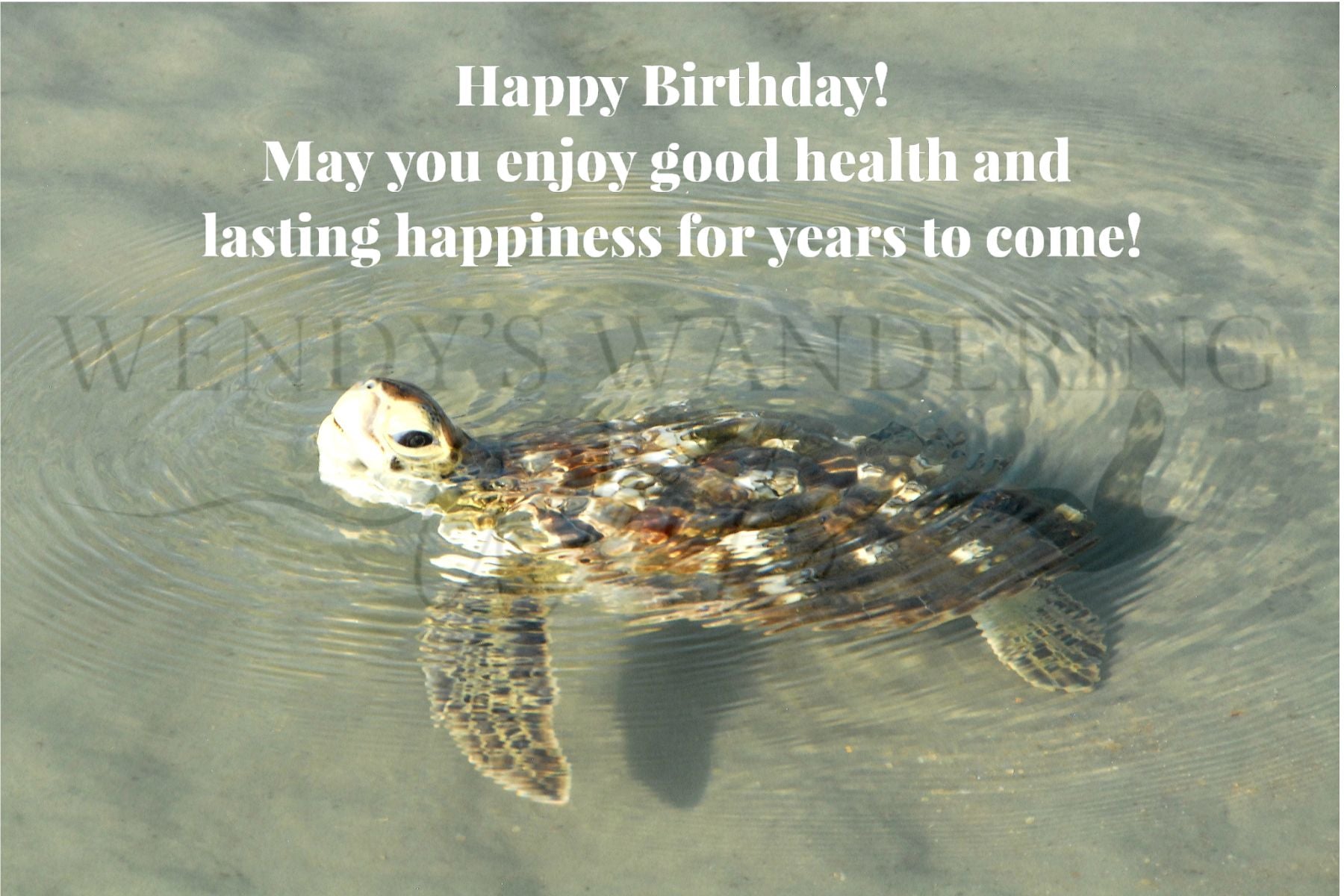 In a peaceful tide pool, a green sea turtle glides close to the camera, casting a wise sideways glance as if sharing a secret wish. With gentle ripples around him and calm waters ahead, the message above reads: "Happy Birthday. May you enjoy good health and lasting happiness for years to come." A serene and heartfelt card for someone whose journey deserves smooth seas and sunny days.