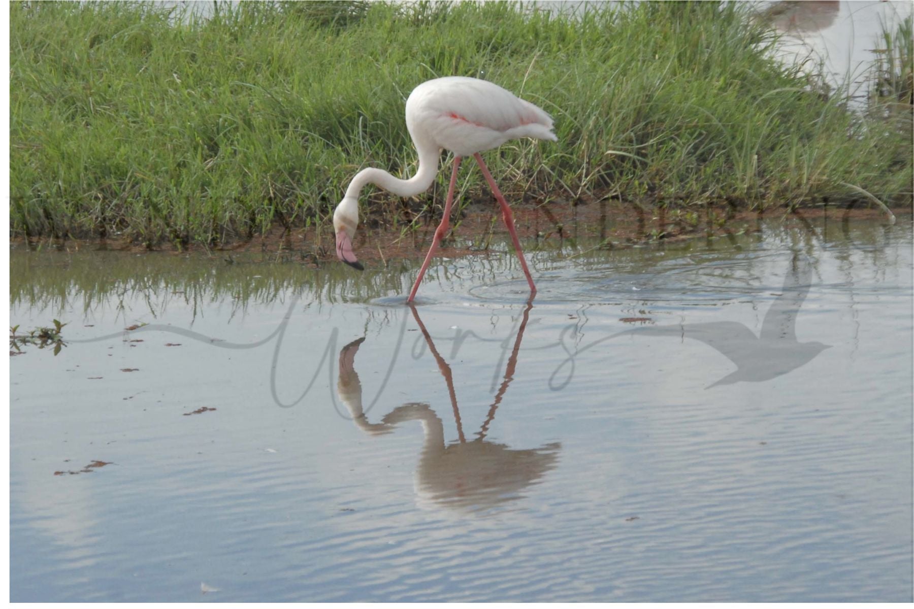 Bathed in soft light, a South African flamingo stands poised in shallow water, its elegant reflection rippling beneath it. The backdrop of lush green vegetation contrasts beautifully with the bird’s rosy plumage, capturing a serene moment where grace meets stillness in perfect harmony.