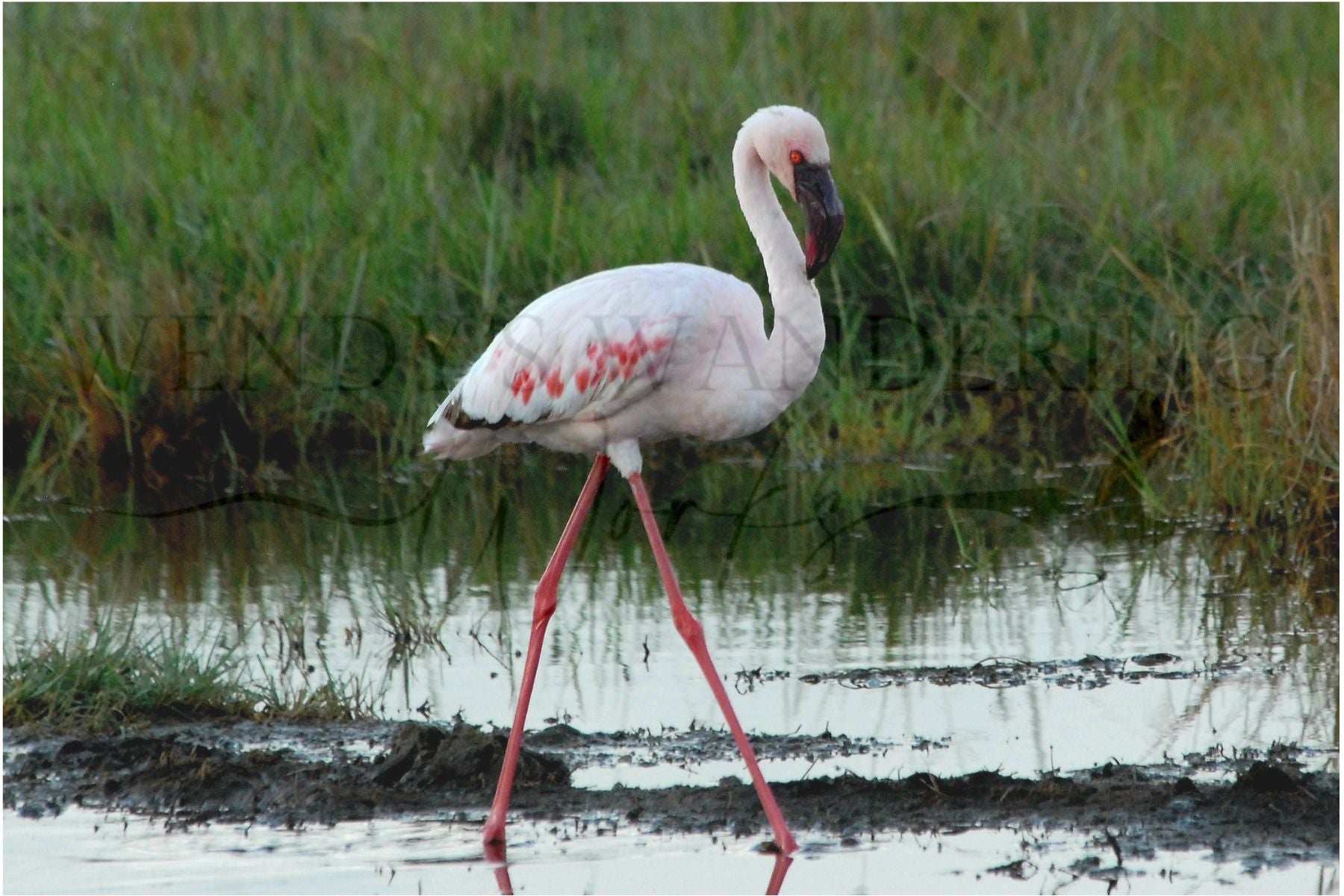 Amid the stillness of muddy shallows and the soft sweep of grasslands beyond, this African flamingo stands with quiet elegance. Its slender form and blush-pink plumage bring a touch of grace to the rugged wetland, a striking contrast of beauty and resilience in the wild heart of Africa.