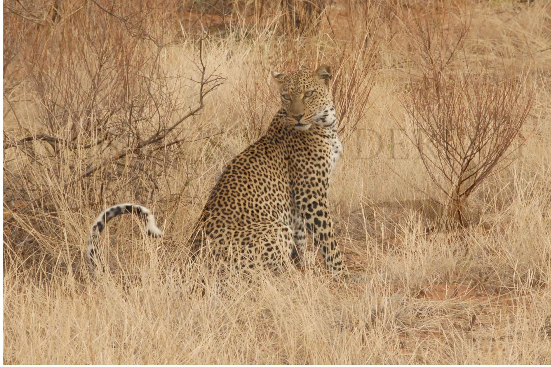 Bathed in golden light and surrounded by a sea of tawny grass, this South African leopard sits in perfect stillness—tail curled upward, muscles coiled beneath his sleek coat. His gaze is fixed on something beyond the frame, a quiet reminder of the predator’s patience and precision. A portrait of wild focus, strength, and grace in its purest form.