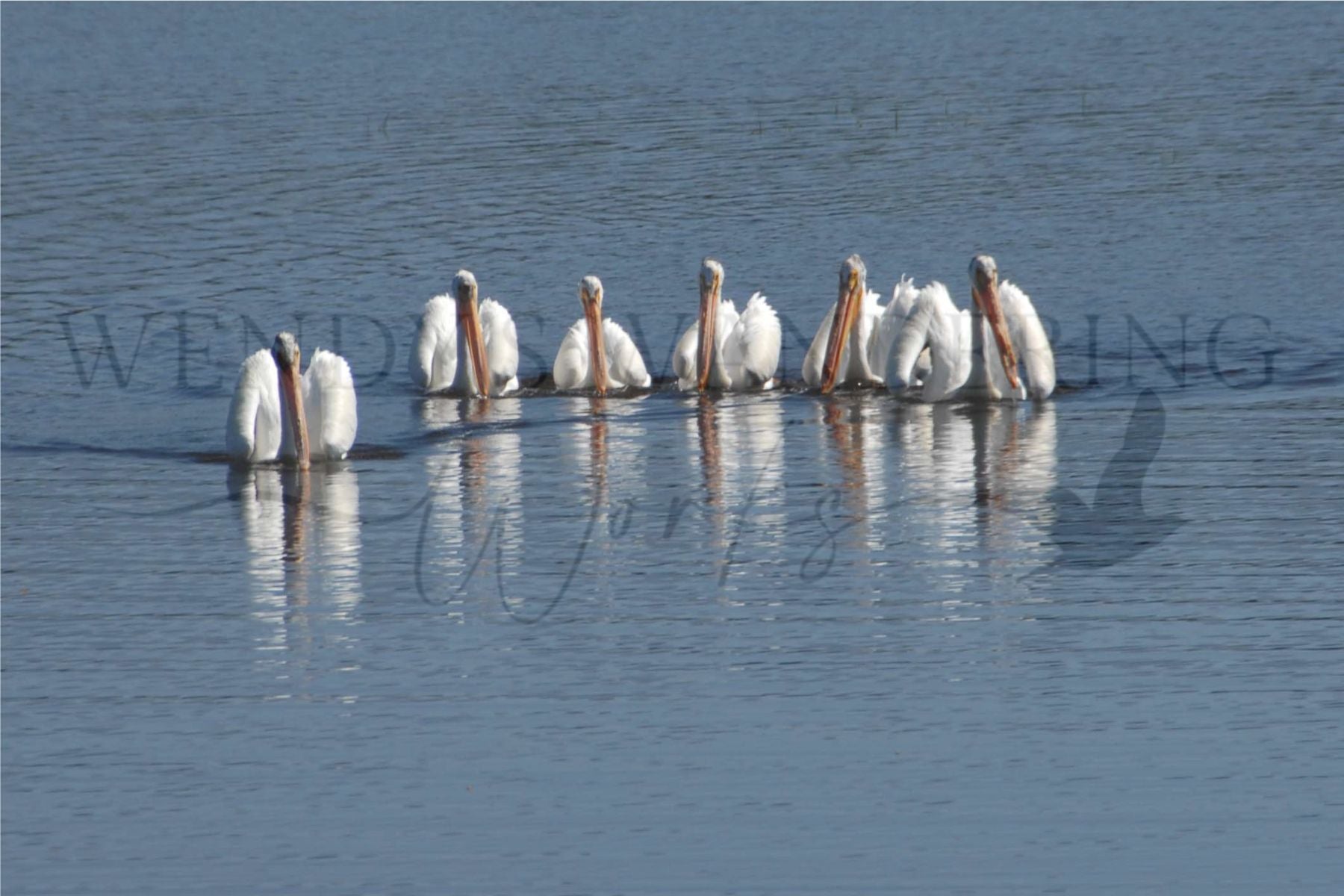 Gliding in perfect unison across a still blue surface, these five American White Pelicans create a striking display of symmetry and serenity. Grace in Formation captures a rare moment of peaceful coordination, their broad wings tucked as they move effortlessly through the water. The soft reflections beneath them add a dreamlike quality, honoring the quiet elegance of these majestic birds in their natural rhythm.