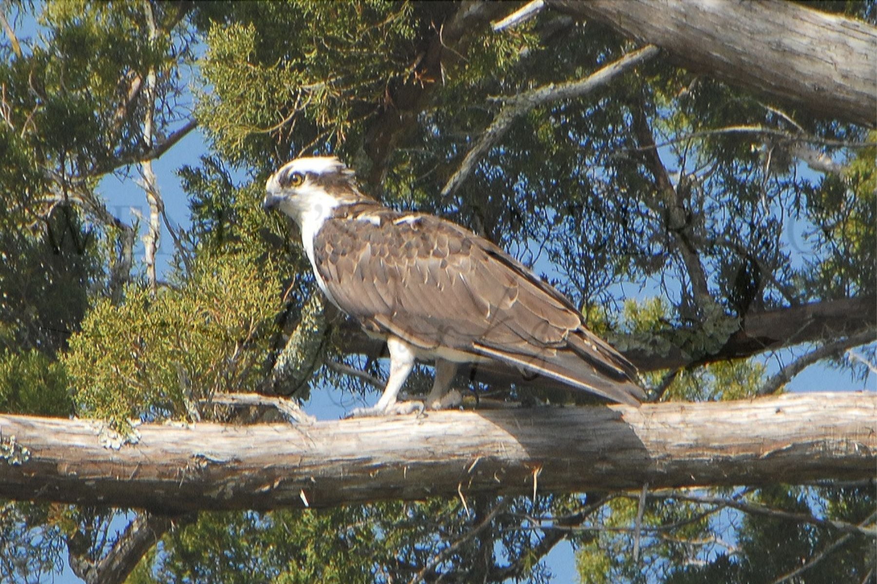 Perched on a weathered tree branch, an Osprey surveys the world below with focused intensity. Its striking markings and powerful stance speak to its role as a master hunter of the skies and sea. Framed by a tangle of green foliage and blue sky, The Watchful Fisher captures a moment of quiet precision in nature’s wild rhythm.