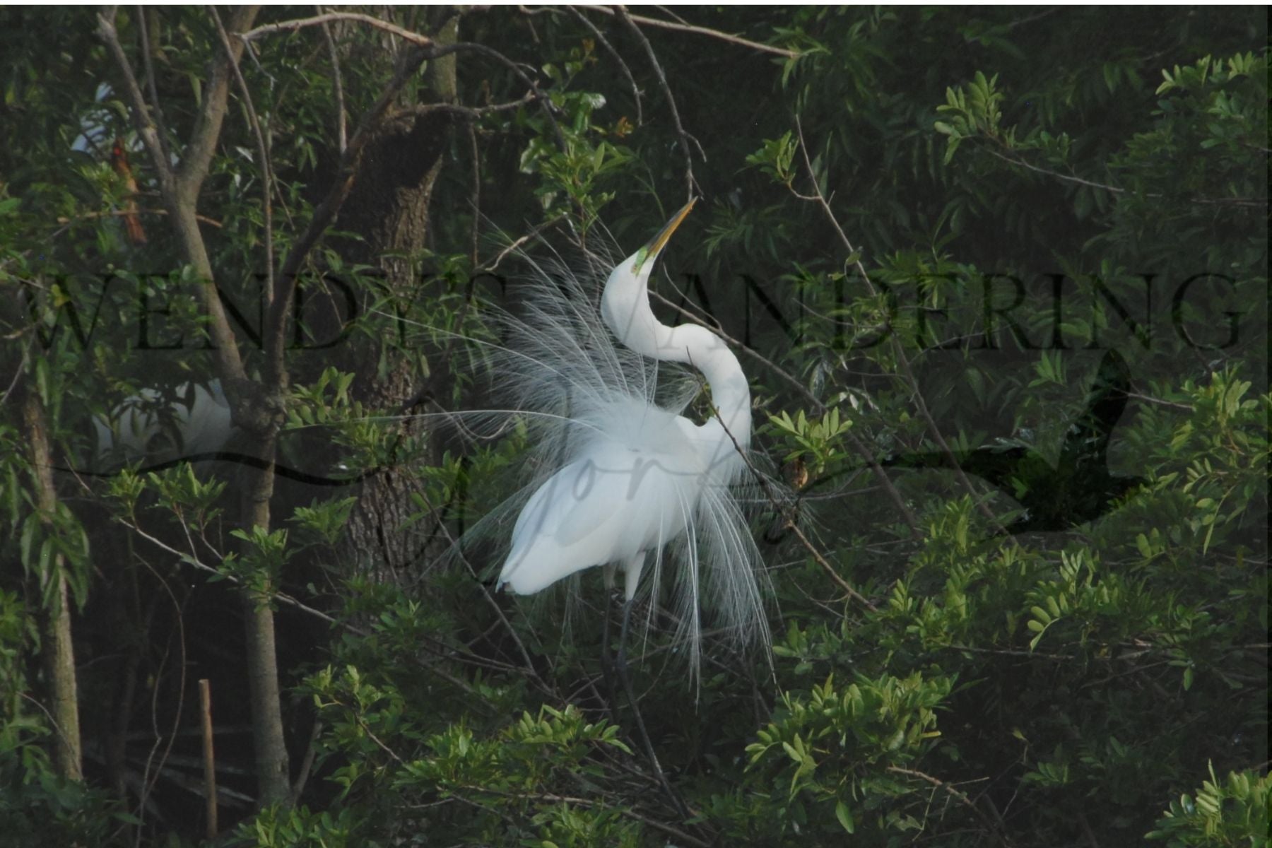 Perched quietly among a canopy of green, a Great Egret unfolds its breeding plumes in a radiant fan of white silk. Surrounded by leaves that frame this natural display, the egret becomes a living sculpture—graceful, poised, and impossibly elegant. A celebration of courtship and the wild beauty of spring.