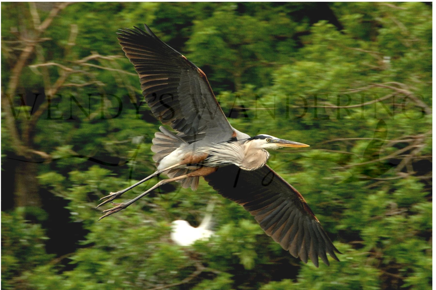 With wings fully outstretched, a Blue Heron soars past a lush backdrop of vibrant green, embodying both strength and grace. Caught mid-flight, its wide wingspan and focused gaze reveal the elegance of a master of the marsh. Wings of the Wetland captures the quiet power and natural artistry of this iconic bird in motion.