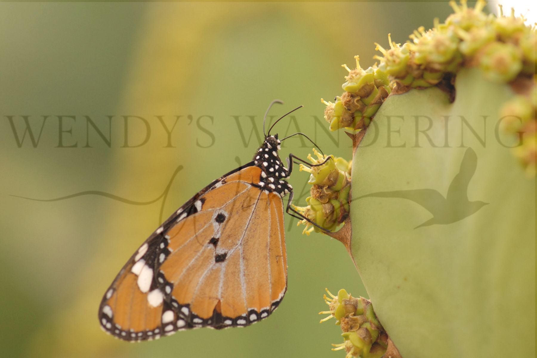 Poised atop a budding prickly pear, the South African Queen Butterfly rests with quiet majesty. Its rich, russet wings shimmer softly in the desert sun, a warm contrast to the tender green pads and emerging buds below. This fleeting encounter between thorn and grace captures the resilience and beauty of life in bloom—even in the most rugged places.
