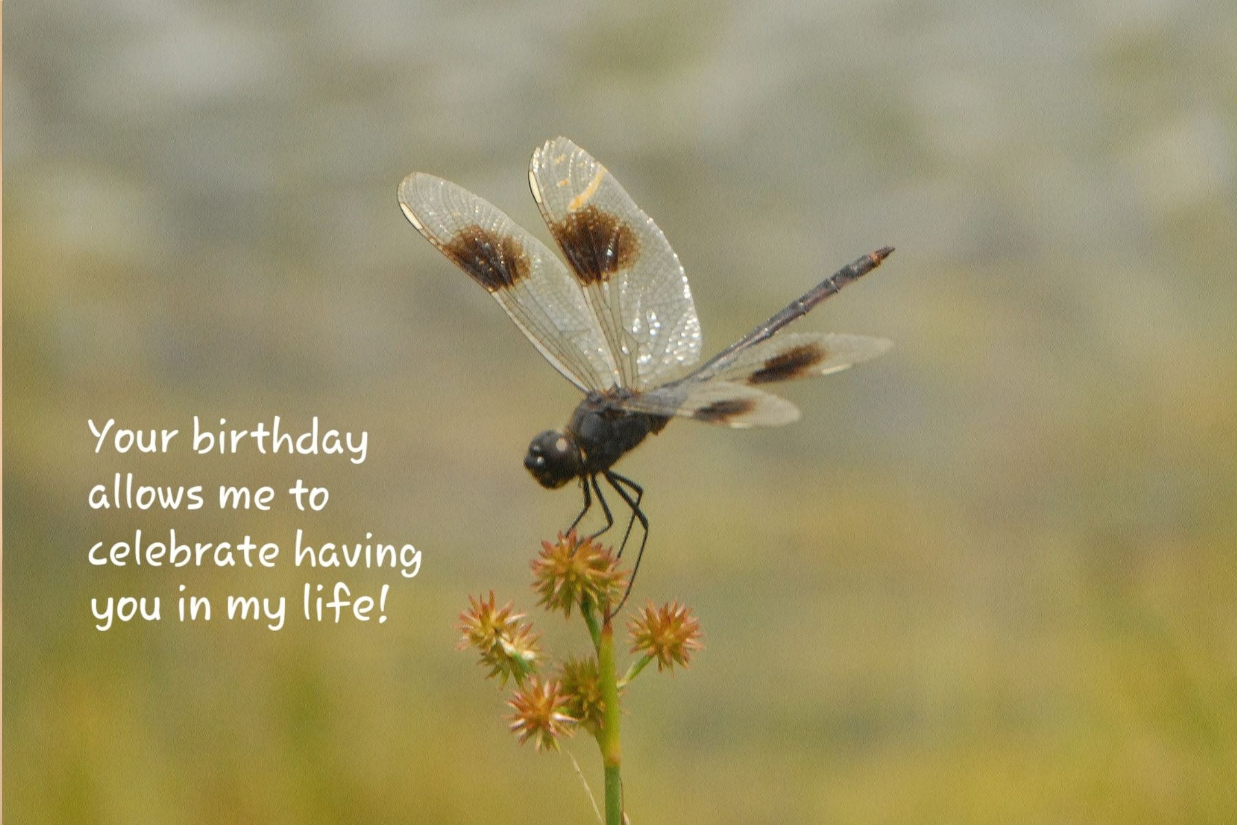 Delicately perched on a small flower, a Four-spotted Pennant Dragonfly rests in quiet elegance—its wings catching the light like nature’s own stained glass. Off to the side, a heartfelt message reads: "Your Birthday allows me to have you in my life." This card is a gentle reminder that some souls, like the dragonfly, bring beauty and meaning just by being near.