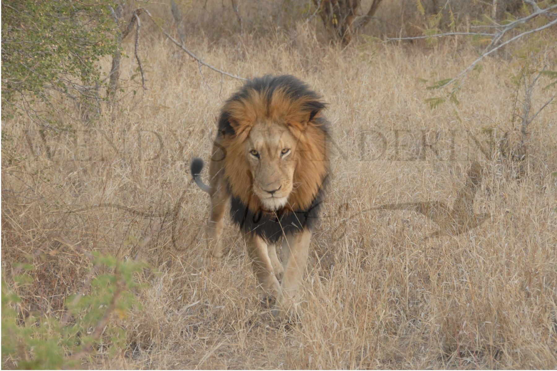 In the hush after sunset, a male lion moves slowly through the withered grass, his mane touched by the last whispers of light. There is no rush in his step—just the quiet certainty of a ruler who knows the land is his. As twilight deepens, his silhouette becomes a living echo of strength and serenity.