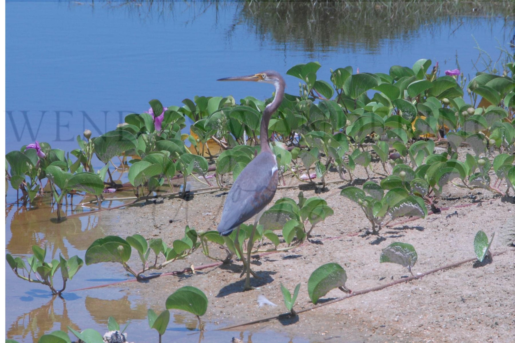 Bathed in soft morning light, a Blue Heron stands poised on wet sand at the water’s edge, framed by trailing vines adorned with bursts of hot pink flowers. Though the vines cast delicate reflections around it, the heron seems to hover in quiet stillness—its elegant form untouched by shadow, as if nature itself holds its breath in reverence.