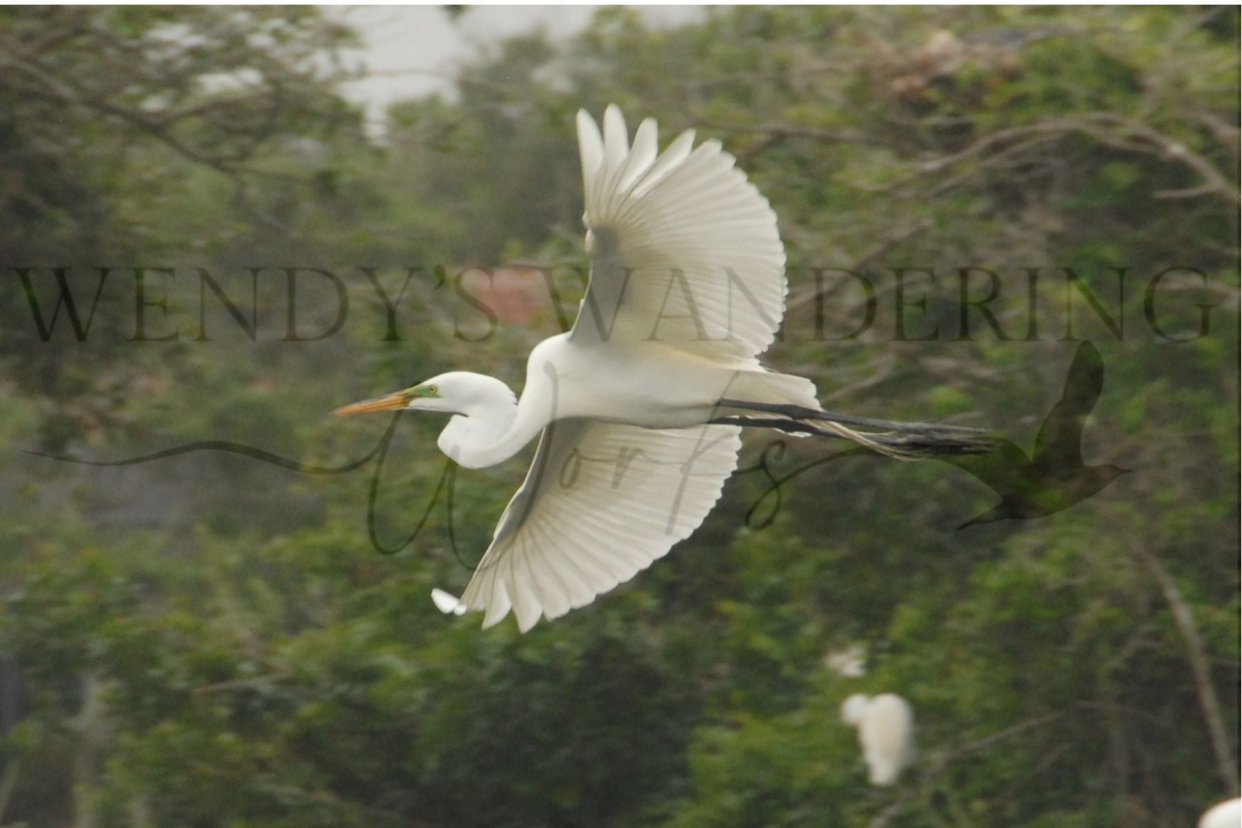 With wings fully outstretched and pure white feathers gliding against a lush green backdrop, this great egret soars in perfect harmony with nature. Caught mid-flight, it embodies elegance, freedom, and the quiet beauty of the wetlands.