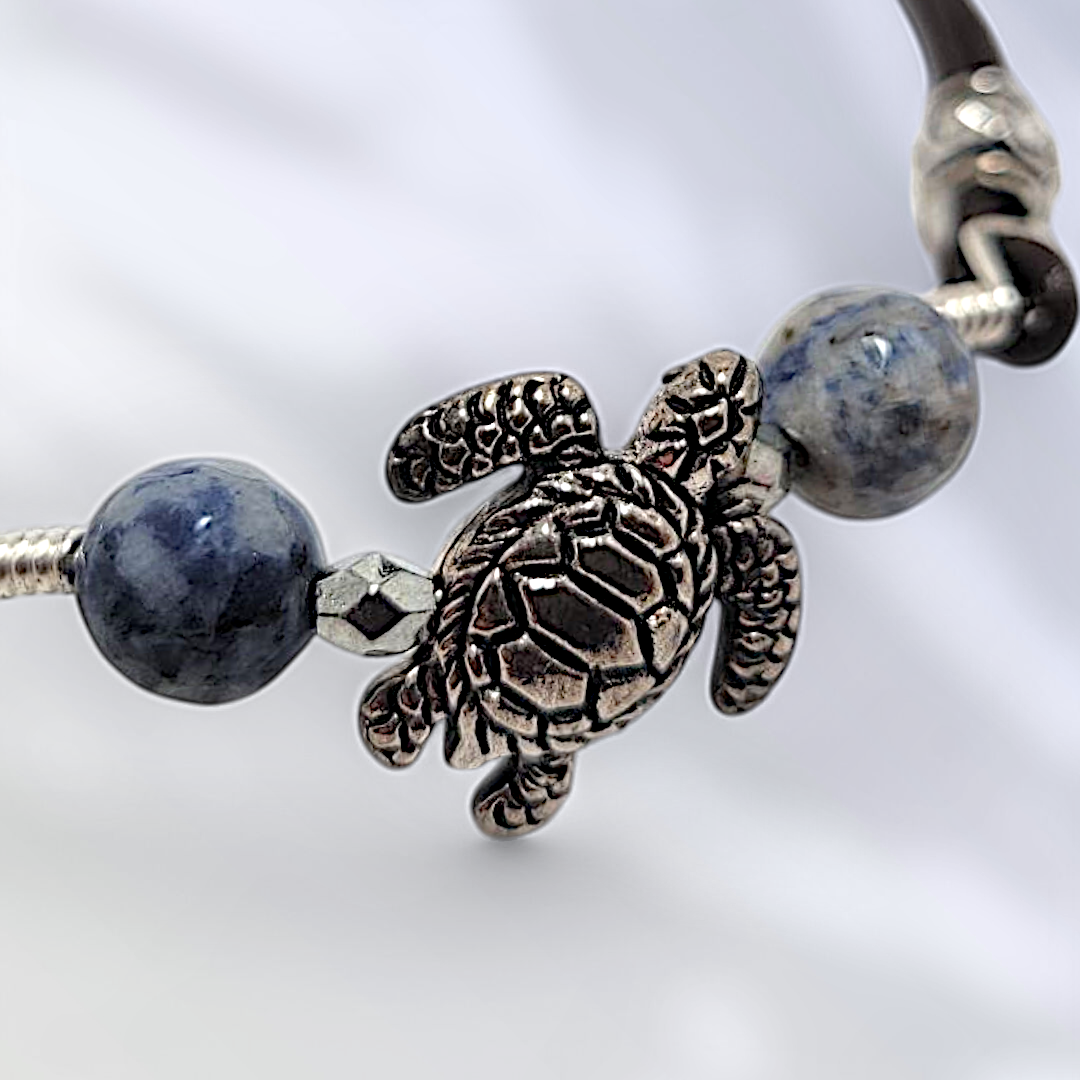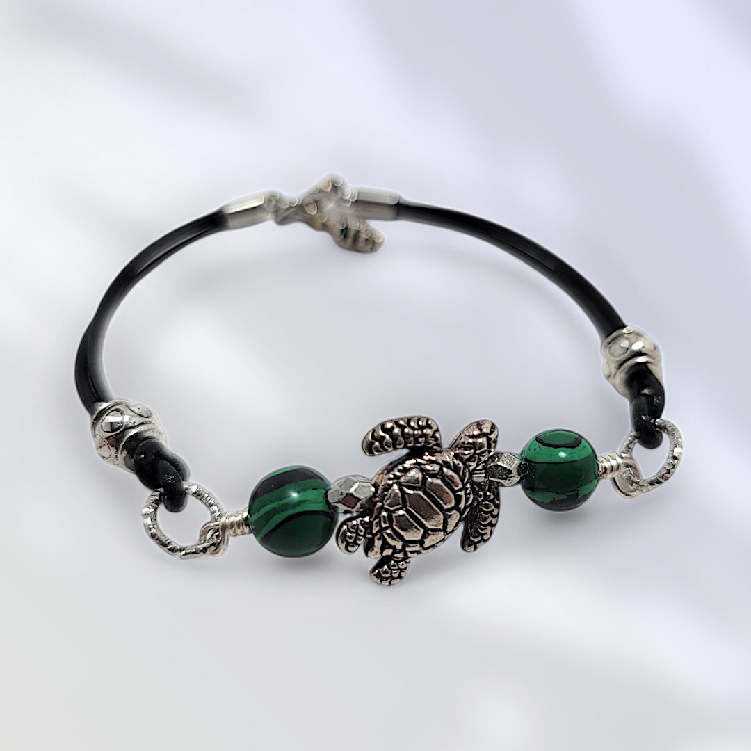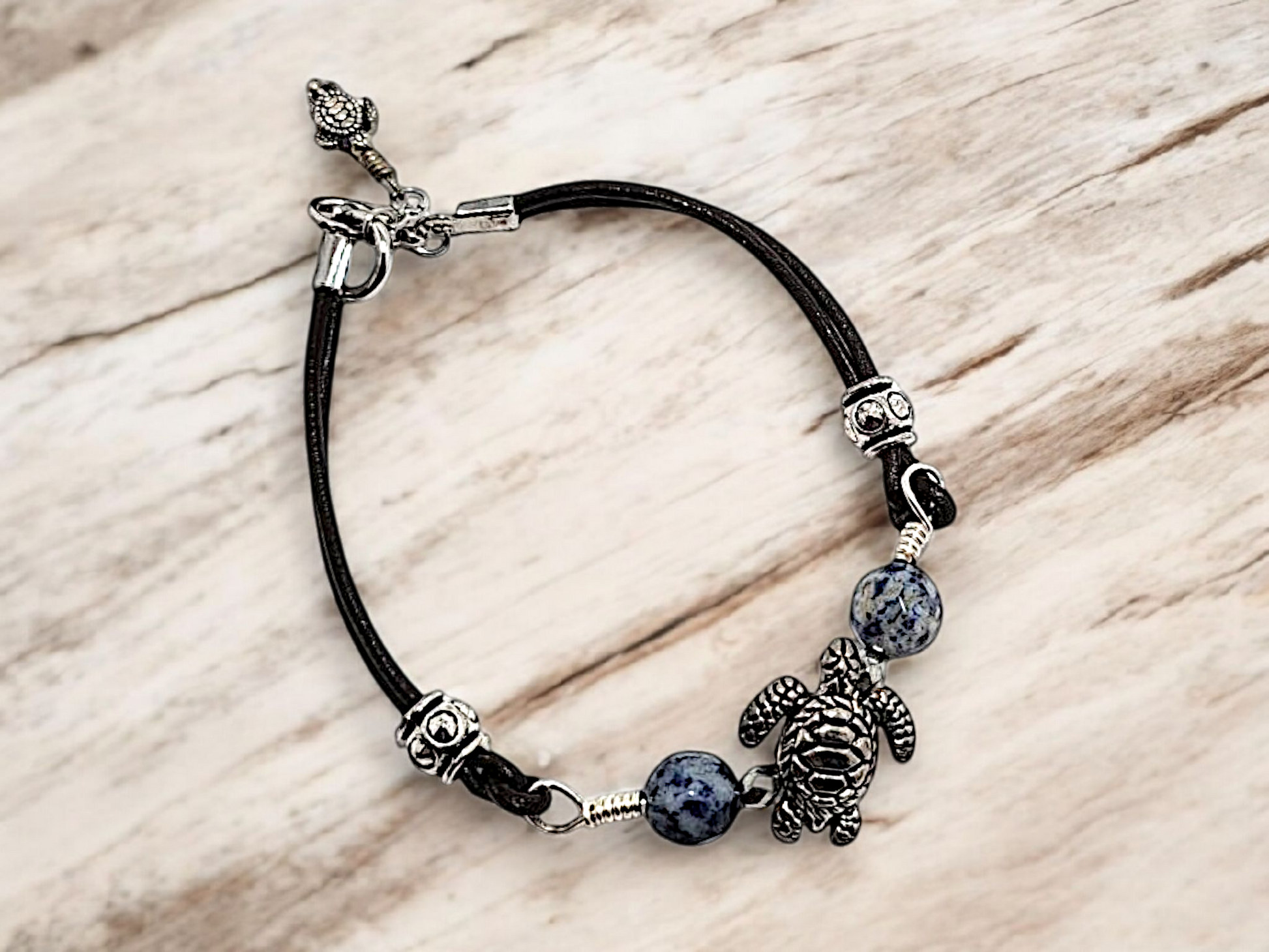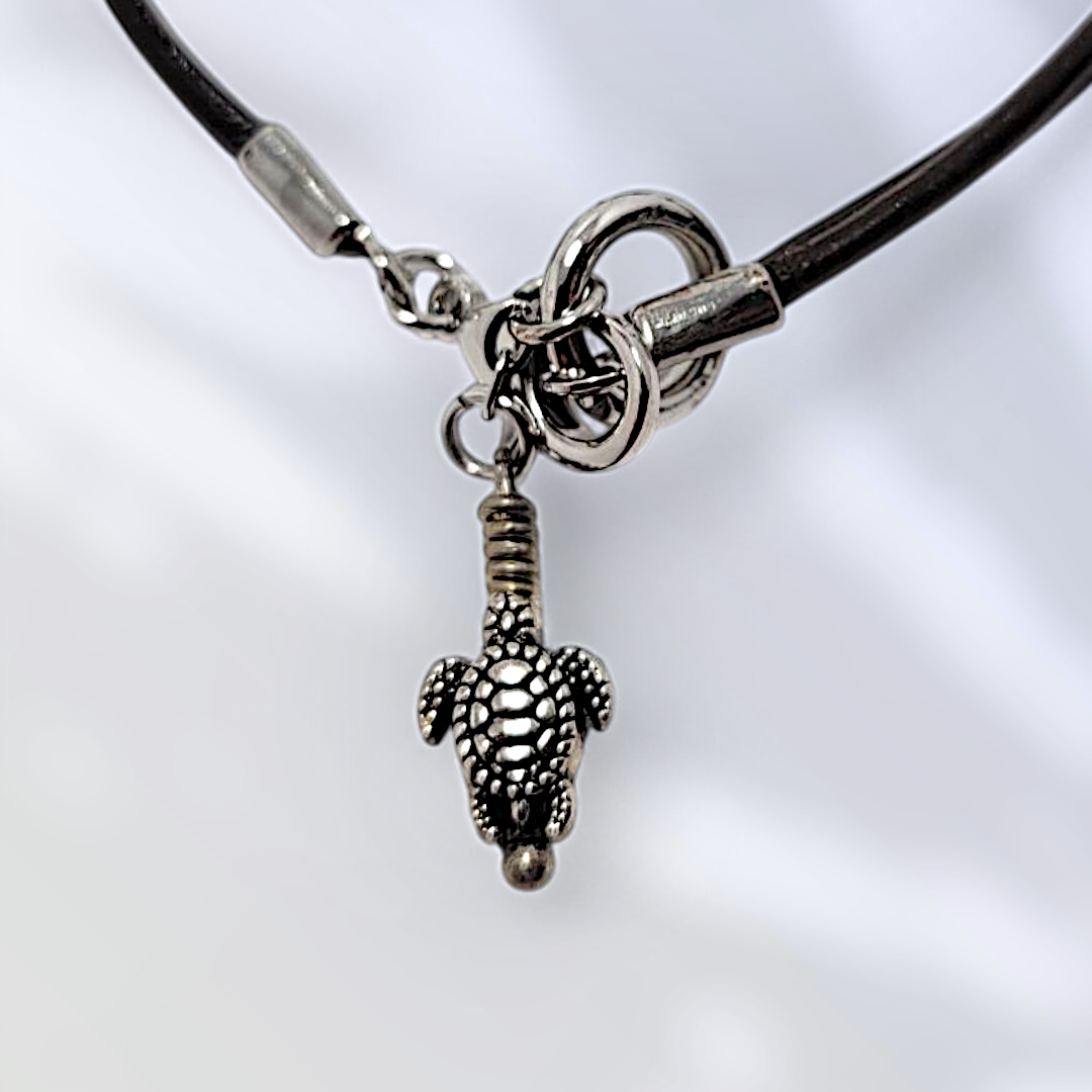 Celebrate coastal charm with the Leather Turtle Bracelet—a handcrafted accessory that brings together bold textures and ocean-inspired details. Made with smooth black leather, this bracelet features a silver-tone turtle charm as a symbol of strength, tranquility, and connection to the sea.