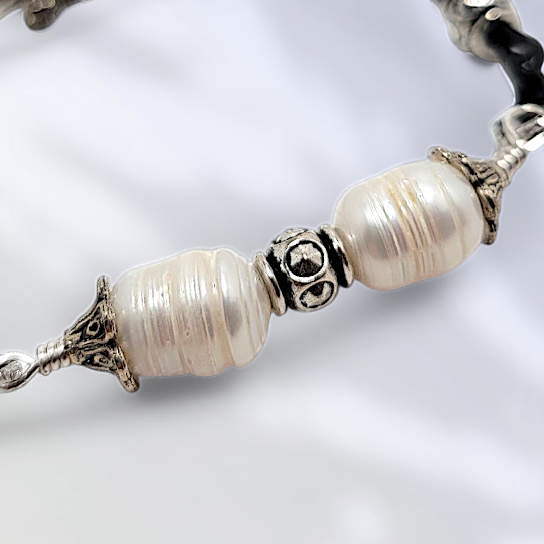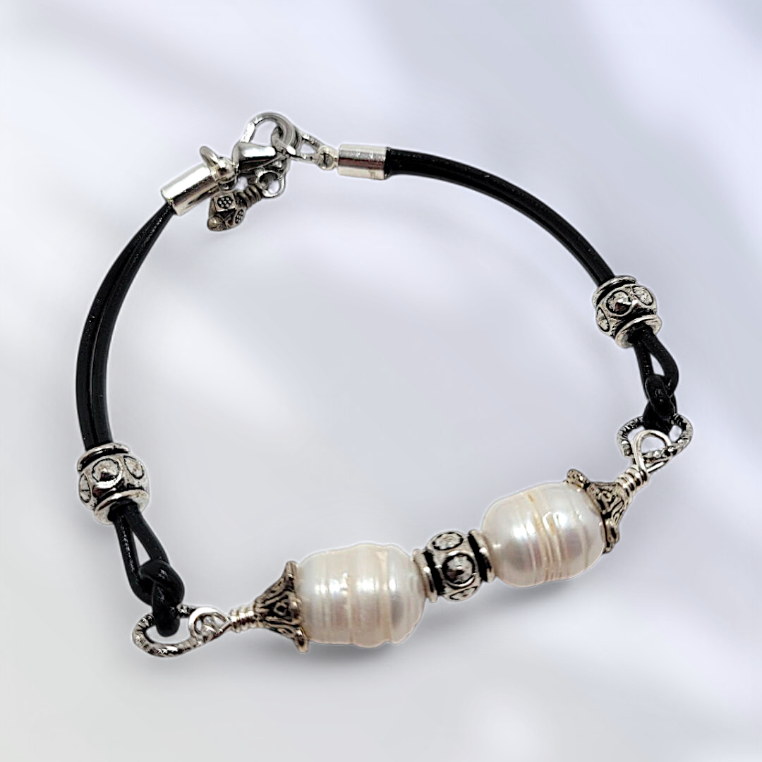 Celebrate coastal elegance with the Leather Pearl Bracelet—a handcrafted accessory that blends natural beauty with timeless style. Made with smooth black leather, this bracelet features two luminous freshwater pearls framed by vintage-inspired silver-tone accents for a refined, ocean-chic look.