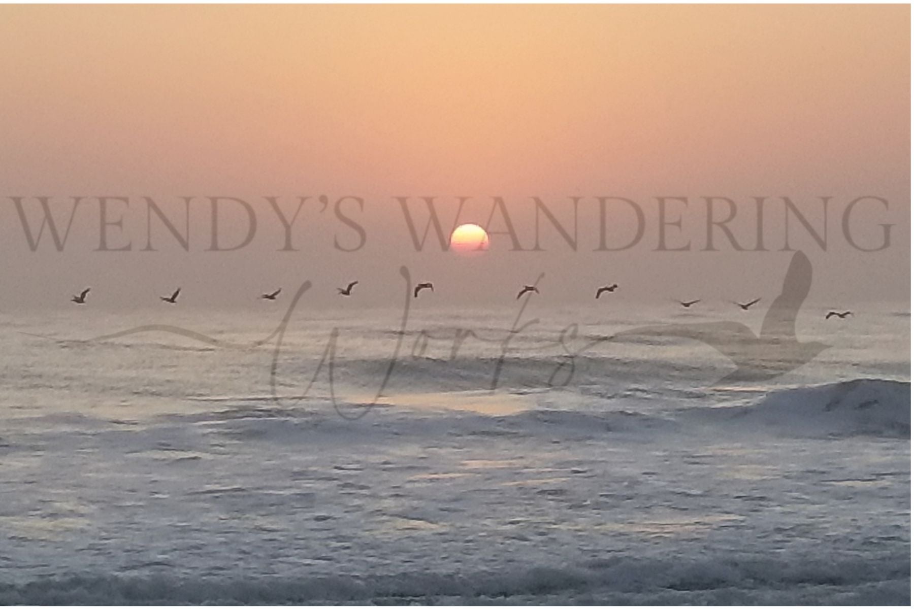 In the quiet glow of a new day, a line of pelicans glides in single file over the shimmering ocean. The sun, a soft hazy orb, hangs low above the horizon, casting an amber wash across the water. Their silhouettes move in rhythm, a graceful procession against the orange-tinted sky. This serene scene captures the calm purpose of morning flight—nature's daily ritual, carried on wings over light and tide.
