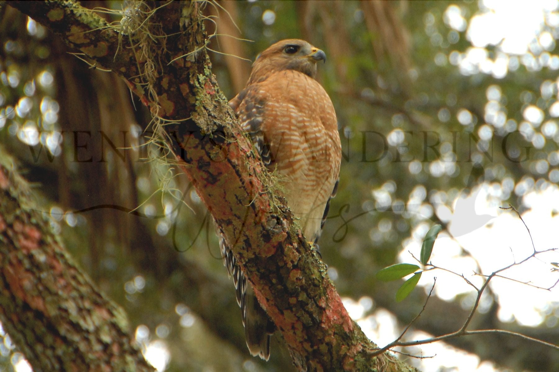 Perched boldly on a thick, weathered branch, a red-shouldered hawk gazes outward with piercing focus. Seen from below, its rich russet breast and sharp face are framed by the layered textures of its tail and the perch it commands. Beneath it, the branch is mottled with green and red algae, echoing the colors of the bird itself. This upward view captures the quiet power and watchful presence of a hunter surveying its coastal domain.