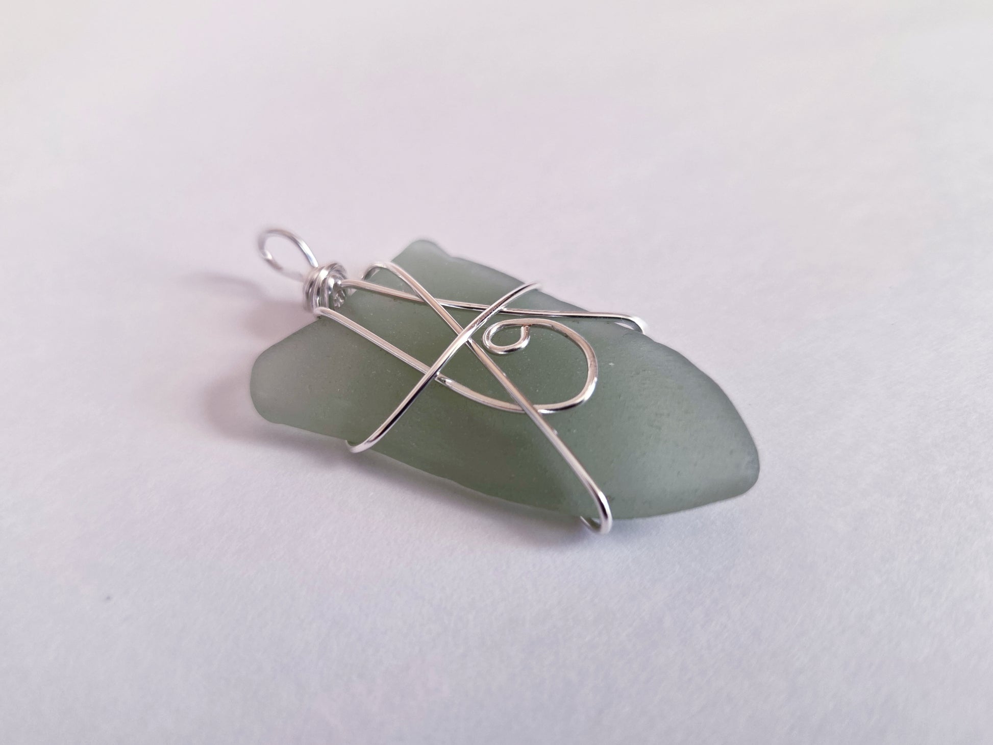 This handcrafted sea glass pendant features a softly frosted, pale green shard shaped by the ocean and time. Measuring 1 1/2 inches in length and 1 inch in width. The naturally smoothed glass is wrapped by hand in shimmering silver wire, creating an elegant, flowing design that securely cradles the glass while highlighting its organic contours. Delicate wire curves add a subtle artistic flourish, giving the pendant a balance of strength and grace.